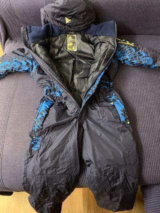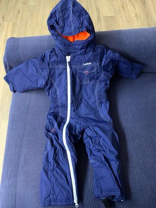 Mono de esquí para niño de 3 años, ideal para disfrutar de la nieve. - Color azul marino con detalles naranjas en el interior. - Cierre frontal con cremallera blanca. - Capucha integrada. - Bolsillos delanteros con solapa. Estado impecable, usado una única ocasion