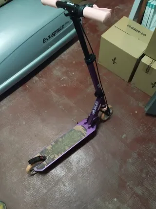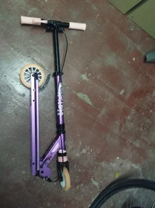 Patinete infantil de color lila y rosa con detalles y diseño llamativo en la base. - Manillar ajustable. - Ruedas de color claro. - Base con diseño gráfico. -maneta de freno Tengo 2 unidades. Poco uso Pvp nuevo 69.90eur