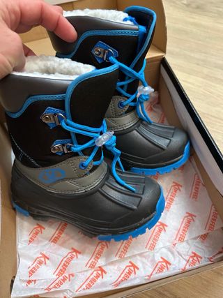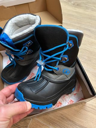 Botas de nieve para niño de la marca Kimberfeel. - Exterior en negro y azul. - Forro interior cálido. - Cierre con cordones y tanca. Talla 28, se ha usado en 2 ocasiones solamente. Como se ven en las fotos están nuevas
