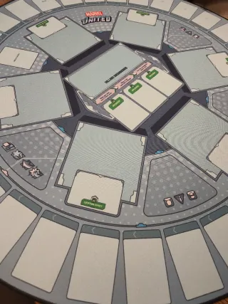 Tapete de mesa redondo para el juego de mesa Marvel United. Presenta un diseño circular con espacios para cartas y marcadores. Tapete oficial de Marvel united - Diseño temático de Marvel. - Forma redonda.