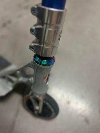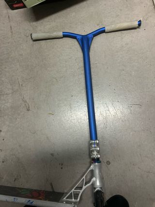 Scooter personalizado con componentes de alta calidad. Precio original con piezas 400 euros. - Manillar en forma de Y de color azul. - Puños grises. - Base plateada.