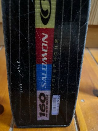 Esquís Salomon Street Race de 160 cm. - Diseño deportivo con detalles en amarillo, rojo y azul. - Marca Salomon visible en los esquís. - Fijaciones negras incluidas.