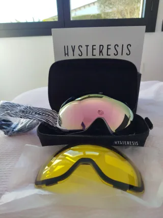 Set de gafas de esquí o snowboard de la marca Hysteresis. Incluye lentes intercambiables y funda protectora. - Lente principal con acabado espejado y tintado rosado. - Lente adicional de color amarillo. - Incluye funda rígida con cremallera. - Correa ajustable con diseño. - Bolsa de tela para protección.