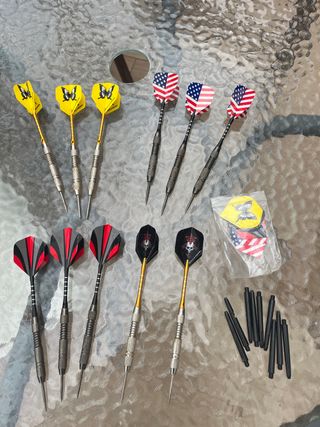 Set de dardos profesionales con diferentes diseños. - Tres dardos con diseño de bandera americana. - Tres dardos amarillos con diseño de mariposa. - Tres dardos con diseño de calavera y alas. - Dos dardos con diseño de alas rojas y negras. - Incluye repuestos para puntas y aletas.