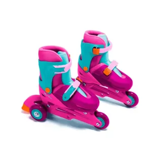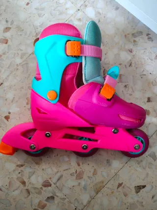 Patines infantiles con un diseño divertido en colores rosa y turquesa. Son ajustables para adaptarse al crecimiento del pie. - Cierre de hebilla. - Ruedas resistentes. - Talla de la 31 a la 34. - Se puede poner en linea o como salen en la foto.