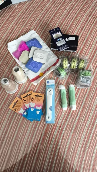 Lote de mercería variada para tus proyectos de costura. Se vende en lote y por separado - Dos bobinas de hilo de color beige. - Tizas de sastre en varios colores: rosa, azul y blanco. - Cinta métrica enrollable. - Agujas de coser. - Enhebrador de agujas. - Cinta de bies blanca.