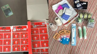 Lote de mercería con una gran variedad de artículos para tus proyectos de costura y anualidades. Se venden también por separado. - Cintas de diferentes colores y diseños. - Pompones de varios tamaños y tonalidades. - Adornos y pasamanerías. - Materiales para bisutería.