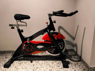 Bicicleta de spinning marca Tentable, modelo SP 800. - Color negro y rojo. - Diseño robusto y estable. - Sillín acolchado de repuesto ya que el original tenía una tela que se rajaba a la mínima. - Manillar ajustable, le fafaltan los apoya brazos. Ideal para mantener activo en casa. Precio algo negociable