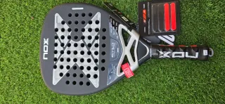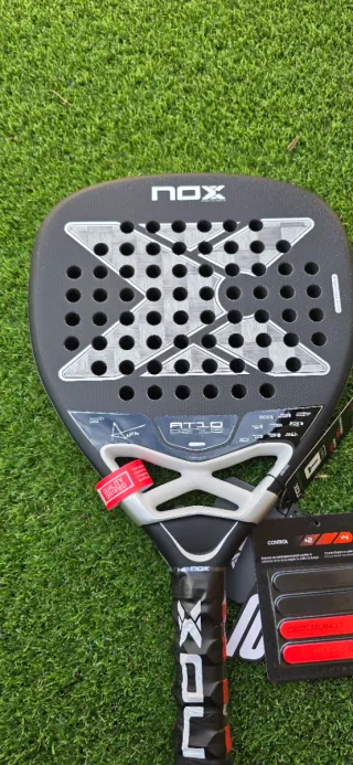 Pala de pádel Nox AT10 18K. - Modelo 2026. - Acabado en negro con detalles plateados. - Diseño con agujeros en la cara. - Empuñadura negra con logo.