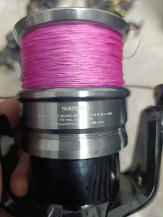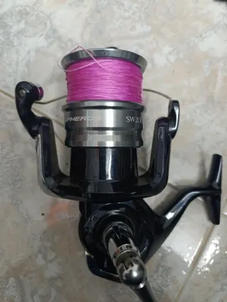 Carrete de pesca Shimano Spheros SW20000 - Color: Negro y plateado. - Bobina con hilo rosa.