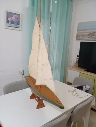 Maqueta de velero de madera con velas de tela. - Casco de madera pintado. - Mástil y botavara de madera. - Velas de tela color crema.