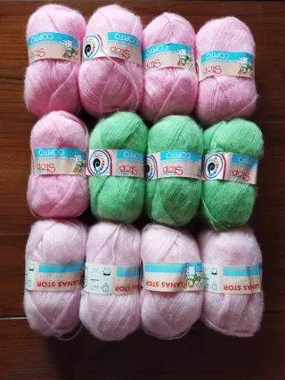 Lote de 12 ovillos de lana Copito, en tonos rosas y verdes. Perfectos para tus proyectos de tejido. - 12 ovillos de lana. - Colores: rosa y verde. - Marca: Copito. El Lote completo 25€, 2,25€/ unidad.