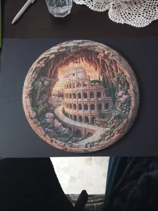 Puzzle circular con imagen del Coliseo Romano, enmarcado por una escena de cueva y vegetación. Puzzle hecho a mano y pegado en fondo negro. El fondo negro por detrás tiene pegatina y se puede pegar. - Piezas de madera. - Diseño detallado del monumento y su entorno.