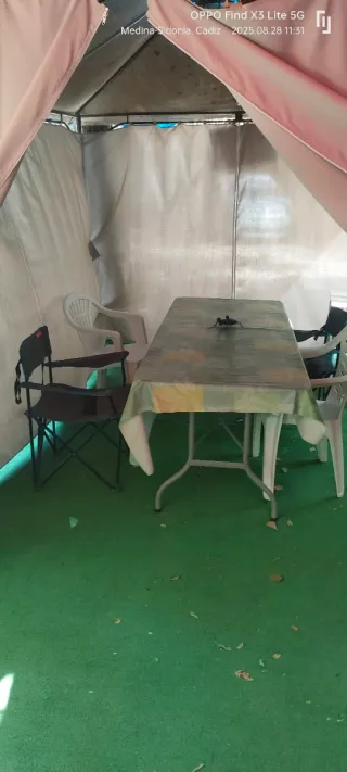 Casa móvil en camping medina sidonia , ideal para estancias temporales. A 20 minutos de playas de Conil, Vejer y Barbate. Tiene dos dormitorios de matrimonio y baño con ducha. Aire acondicionado. Avance con TV nueva, sofá y varios armarios para ropa o otro utensilios de cocina y nevera grande. Cocina exterior con fregadero con agua caliente y fría, otro frigorífico, mueble de cocina y cocina con tres fuegos y horno a estrenar. Carpa con toldo nuevo. Sillas y 2 mesas largas desmontables. Trastero exterior con don barbacoas nuevas, soplador de aire para hojas etc. Buen ambiente en el camping . Se paga 175€ mes con agua incluida.