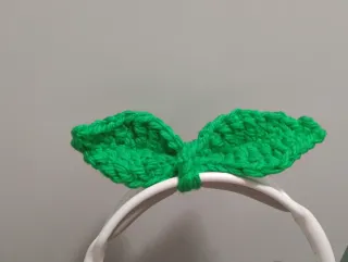 Adorno de hojas verdes hechas a mano con crochet. - Diseño de dos hojas unidas. - Color verde vibrante. - Ideal para decorar accesorios o manualidades. - Perfecto para decorar los cascos o incluso de marcapáginas.
