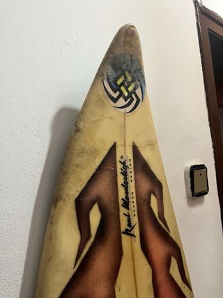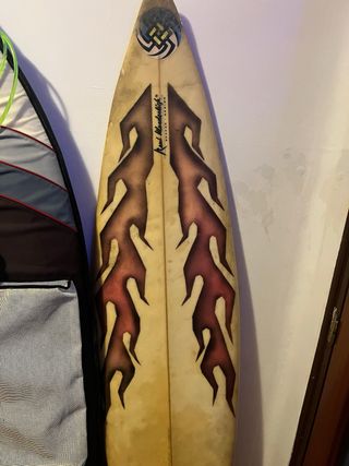 Tabla de surf vintage de la marca NECTAR. Diseño llamativo con llamas en tonos rojizos y marrones sobre fondo crema. Tiene varias reparaciones , los desperfectos que se ven son resina de las reparaciones pero aun le quedanbaños por delante, tambien se puede usar de decoracion o para piezas para reparaciones - Diseño de llamas. - Marca NECTAR. - Estilo vintage. 6,4 con 23 litros aprox