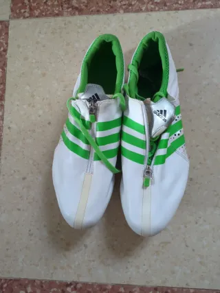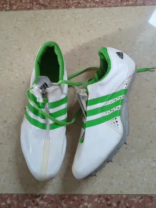 Zapatillas de clavo Adidas en talla 41. Sólo para uso en pista. Recogida en persona Cádiz ( cerca del mercado) - Color blanco con detalles en verde. - Cierre de cremallera.