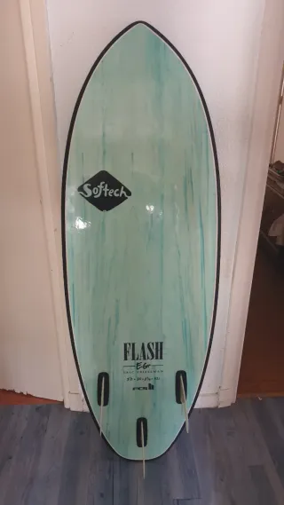 Tabla de surf Softech modelo Flash EG. - Diseño con acabado marmoleado en tonos verdes y azules. - Logo de Softech en la parte superior. - Inscripción FLASH EG y ERIC GEISELMAN en la parte inferior. - Sistema de quillas FCS. - Invento Chanel Islands - Medidas 5.0 x 20 x 2 ⅜ x 32l - Ideal para disfrutar de la playa con olas medianas, la tabla tiene mucha flotabilidad y muy manejable, un juguete. Nueva me costó 350 más invento y quillas.