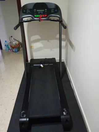 Cinta de correr en color negro, ideal para entrenar en casa. - Diseño moderno y funcional. - Superficie de carrera amplia. - Consola con pantalla digital.