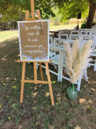 Caballete de madera con un diseño clásico, perfecto para exhibir obras de arte o como elemento decorativo. - Estructura de madera robusta. - Soporte ajustable para lienzos. Lo usé en mi boda y quedó perfecto 🤍