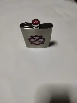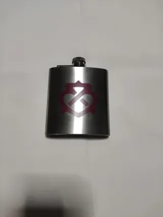Cantimplora metálica con un diseño distintivo. - Material: Metal. - Color del logo: Rosa.