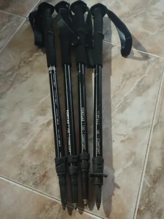 Bastones de trekking TrailBuddy, ideales para tus aventuras. Están en buen estado y listos para usar. Los TrailBuddy están fabricados en aluminio resistente, son robustos y duraderos. Su sistema de ajuste FlickLock te permite adaptar la longitud de manera sencilla. De aluminio - Marca: TrailBuddy - Dos bastones incluidos - Diseño azul y negro - Con correas y puntas de goma