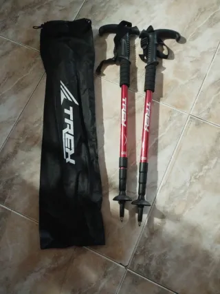 Set de dos bastones de trekking de la marca TREK, ideales para tus aventuras al aire libre. Incluyen una funda para su transporte. - Color rojo y negro. - Empuñaduras ergonómicas.