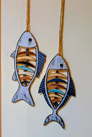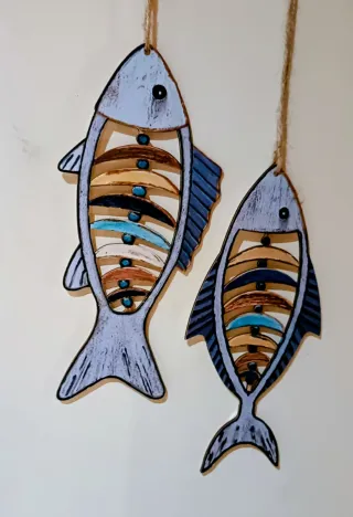 Conjunto de dos peces decorativos para colgar. - Diseño con silueta de pez. - Detalles interiores en madera y cuentas. - Colores variados en el interior.