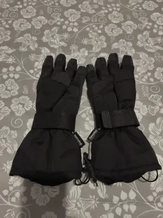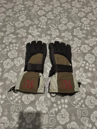 Guantes de snowboard de la marca Higth Times. - Diseño en color negro, marrón y beige. - Cierre ajustable en la muñeca. - Cordón de ajuste en el puño. Thinsulate 100gr El derecho tiene goma para limpiar la lente de las gafas y bolsillo para llevar el Forfait. Talla 9 Protección en las palmas y gripe en las puntas