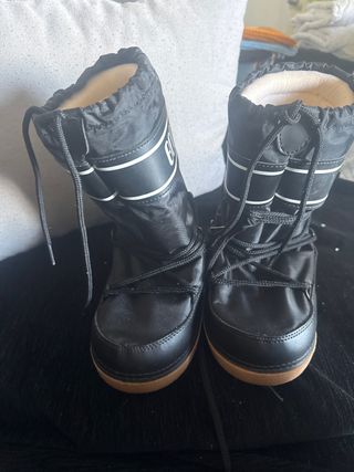 Botas de nieve negras con suela marrón. - Cierre con cordones. - Forro interior cálido. - Detalle de banda blanca con logo. - Usadas una sola vez, estan como nuevas como se puede ver en las suelas, el unico detalle que tiene es un poco desgastes en el interior de una bota