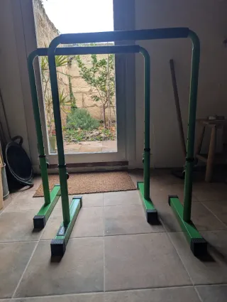 Barras paralelas de la marca Power Guidance en color verde. - Estructura metálica de acero robusto. - Con base antideslizante. - Altura ajustable de 77 a 98 cm. - Barras con agarre acolchado. - Aguanta 544 kg de peso. - Peso del producto 12'2 kg - 53 cm de ancho