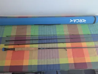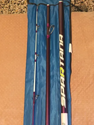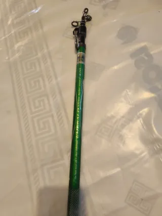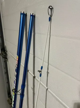 Caña de pescar Quebec 2704 de 2.70 metros de longitud. Está usada como he puesto en las imágenes, pero sigue funcionado muy bien. La vendo por falta de tiempo. Me ha dado buenas capturas. - 4 secciones. - Rango de lance: 100-150 grs.
