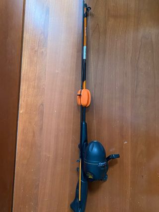 Caña de pesca con carrete, ideal para iniciarse en este hobby. Incluye una caña pequeña y carrete, perfecto para un principiante.