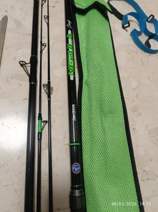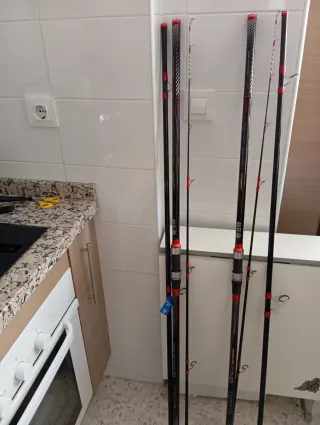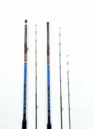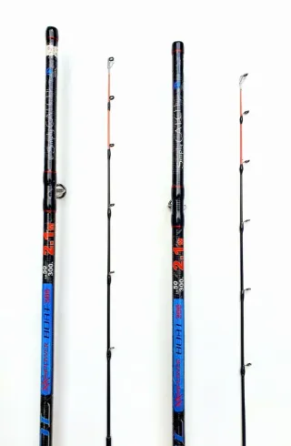 Se venden cañas de pescar de dos piezas con una longitud de 3,30 metros y una acción de 20-80 gramos. Incluyen funda protectora. - Longitud: 3,30 metros - Acción: 20-80 gr - Material: Fibra de carbono