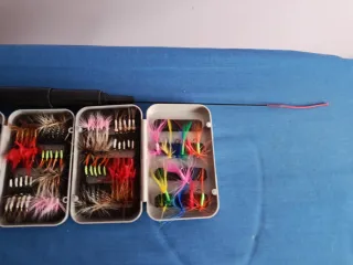 Conjunto completo para la pesca a mosca, incluye una caña y varias cajas con moscas. - Caña de pesca negra de 4.5 m - Siete cajas de moscas de pesca de diferentes colores y tamaños.