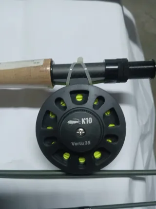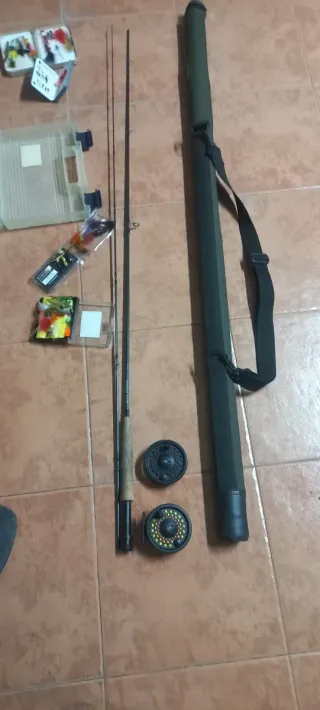 Se vende caña de mosca de 160 metros junto con un carrete a estrenar. - Caña de pesca. - Carrete de pesca.