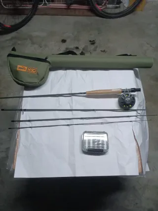 Equipo completo de pesca a mosca, ninfa y tándem. Todo nuevo, con etiquetas. - Caña BFC Discovery HPS 10ft 3wt 4pc. Con puntal de repuesto. - Carrete de pesca imitación vivarelli Semiautomático con 2 bobinas, y guiahilos, una de ellas preparada para pescar al hilo - Línea de pesca WF3F. - Caja de moscas secas y ninfas variadas.
