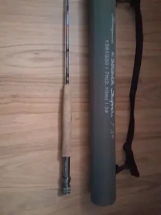 Caña de pesca a mosca utilizada una vez, prácticamente nueva.Sin defecto alguno. Comprada en una tienda de pesca trucha y spinning. -Es de 9 pies 2,76m, recojida unos 72 cm -Acción media #5 -Lleva 9 anillas y una cerámica - Mango de corcho sin desgaste algúno - 4 secciones