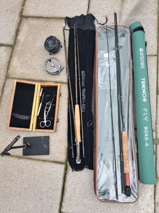 Caña de pesca a mosca que incluye caña carrete, funda y accesorios. - Caña de 9 pies línea 6-7 - Funda tubo - carrete con dos bobinas y con líneas flotante y hundida - Moscas variadas a para black bass y truchas. Bajos de línea. Etc