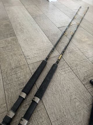 Conjunto de dos cañas y carretes para pesca de curricán CAPERLAN 170 cm, 20-40 lbs + carrete CAPERLAN Reveal 30 lbs + Hilo 0.5 mm, 30 lbs, 400 m 200€ las dos; 110€ una No vendo caña o carrete separados, no envío, no me interesan cambios.