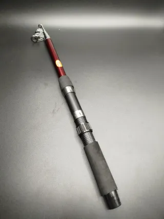 Caña telescópica de color verde con empuñadura de goma espuma, bastante compacta al plegarla. El portacarretes es metálico de rosca trasera. No tiene marcas visibles de una marca conocida (o se han borrado), pero el diseño es simple, robusto y perfecto para pesca ligera: río, lagos o costa, con señuelos pequeños o cebos.