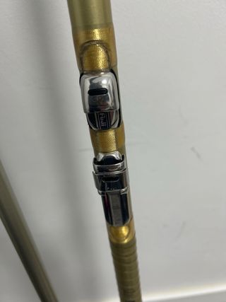 Caña de pescar vintage estilo Spinning Rod. Ideal para coleccionistas o para quienes aprecian el material clásico. - Material de la caña: Madera. - Color: Amarillo con detalles marrones. - Incluye carrete Shimano.