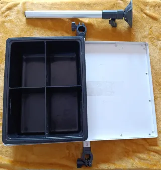 Bandeja de pesca Colmic con divisores internos para organizar tus accesorios. - Bandeja negra con cuatro compartimentos. - Base blanca. - Soporte metálico ajustable. - Bandeja colmic + pata regulable, para panier pata 25mm , 30mm , 36mm COLMIC SENSAS Milo Rive carpa pesca cañas Shimano stonfo trabucco maver sensas anzuelos boyas flotadores