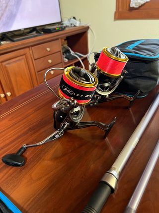 -Pareja de cañas Daiwa liberty surf 33 híbrid . - Portacarrete Fuji cremallera - Argollas Fuji alconite - Pareja carrete chimano 14000 xse - Incluye dos bobinas ( una competición y la otra para pelo 0,35 mm ) Las dos originales