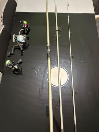 Lote de dos cañas de pesca de surfcasting con una acción de 100 - 200 una de tres tramos ( bastante usada) y la otra telescópica en perfectas condiciones si se quiere con luz de led para la pesca de noche y dos carrete pequeños para río