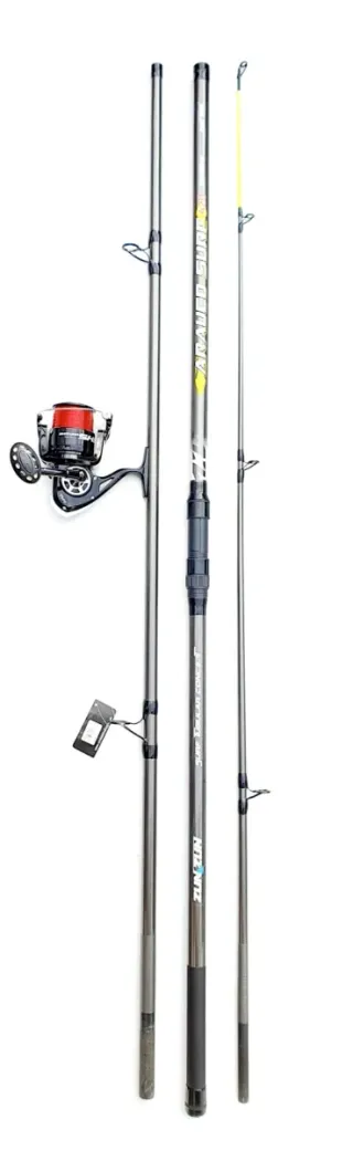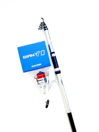 Equipo de pesca para la modalidad del Surfcasting compuesto por : Caña telescópica GRAUVELL TITAN SPORT HUSKY de 4 metros, acción 50-150 gramos + carrete ZUN ZUN GIANT 7000 con bobina de aluminio y 4 rodamientos con hilo puesto. ¡¡ PRECIO OFERTA CAÑA + CARRETE + HILO 59,95 € !!