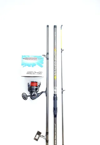 Equipo de pesca para SURFCASTING compuesto por : Caña ZUN ZUN ARAUCO Tubular de 4,20 metros, acción 100 - 200 gramos, carbono composite, anillado LOW RIDER + carrete SHIZUKA SH 8 con 3 rodamientos, sistema anti vibraciones, carrete con bonito diseño Italiano fuerte y de sencillo mantenimiento + hilo puesto. ¡¡ PRECIO OFERTA CAÑA + CARRETE + HILO 75€ !!