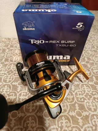 OKUMA TRIO-REX ARENA TXA - 60 CARRETE MUY REBAJADO. REGALO de 3 carretes de hilo sufix xl strong. 2 Rodamientos de acero inoxidable Rodamiento de anti-retroceso Quick set Bobine aluminio Sistema de oscilación del eje en "gusanillo" Sistema de frenos Hydro Block, todo sellado para que no le entre agua Sistema RESII,rotor perfectamente balanceado para perfecto funcionamiento Manivela de aluminio Bobina de repuesto # pesca surfcasting caña hilo de pescar