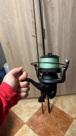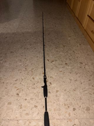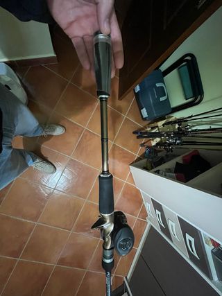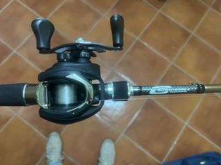 Conjunto de caña y carrete de casting reforzada de pesca esta nueva solo la he usado una vez es una pasada bastante distinta a las normales y el color que lleva y los acabado es preciosa
