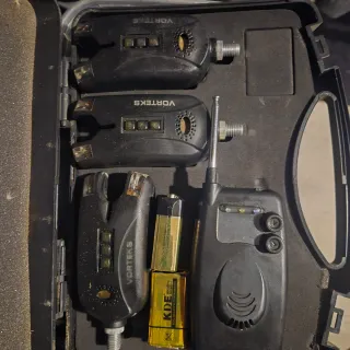 Set de tres alarmas de pesca VORTEX con receptor. - Incluye tres alarmas de picada. - Receptor inalámbrico con antena. - Pilas KDE Alkaline incluidas.
